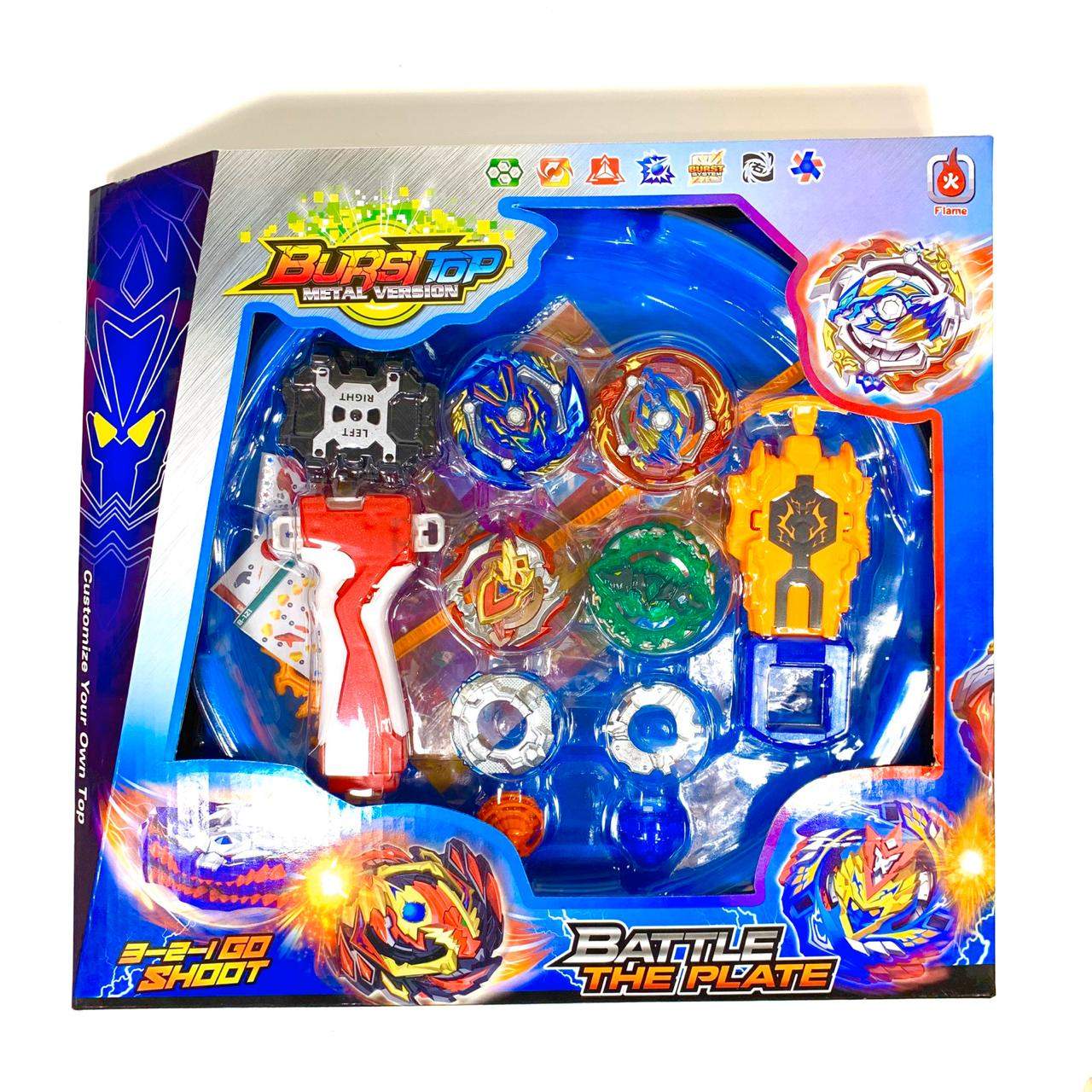 Bursttop Force Metal Version, Battle the Plate - Arena is een set met 2 tolletjes, 2 afschieters en een gevechtsarena van 32 cm. De set bevat tevens extra 1 super power met een shooter launcher afschieter , super power 18 d systeem. Met deze set kunnen kinderen spannende gevechten en tollenspellen spelen in de arena. De tolletjes zijn gemaakt van stevig metaal voor duurzaamheid en krachtige prestaties. Ga de uitdaging aan en beleef urenlang speelplezier met deze Bursttop Force Metal Version, Battle the Plate - Arena set!- SpinTol Arena Compleet - Launcher Game Toy